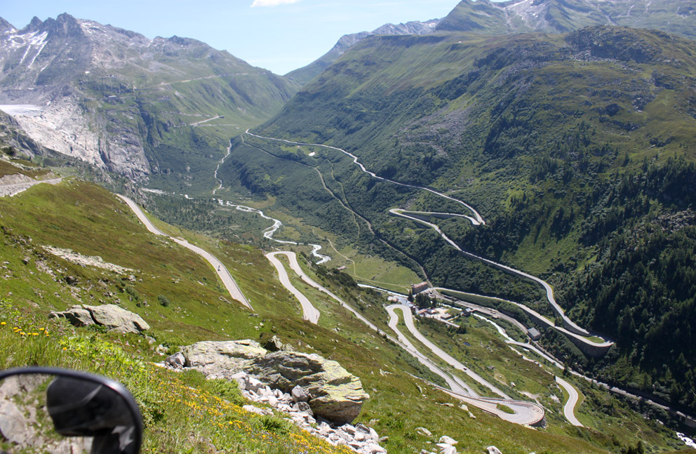 A good morning Cappuccino and pastry woke us up a little and then it was back on our bikes for the long 1,400km (875miles) ride back to London. The fastest and most direct route looked boring so first we hit the Simplon Pass, then cut across to another interesting piece of wiggly road on the map and found another incredible motorcycle road, the Grimsel Pass, a crazy series of mountain corners that’s as spectacular to look at as it is to ride.
