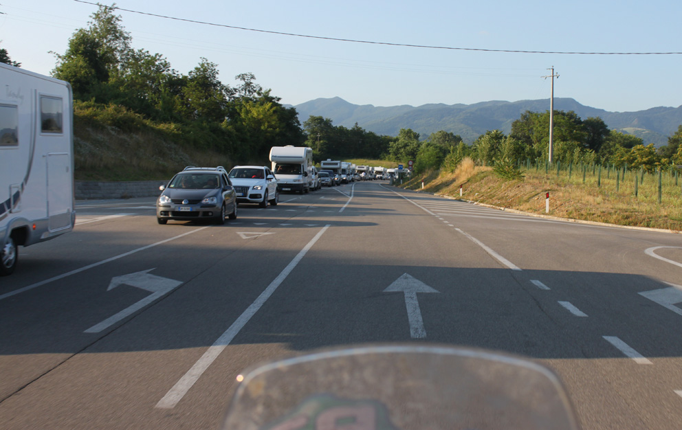 We left late to avoid traffic and get our final fill at the wonderful Alpinestars hospitality but within a 1/4 mile down the road we ran into lines of cars and motorhomes that lasted many miles. I knew of a back road that would meet up with the Futa Pass so we headed the opposite way to the sheep and found the virtually empty and truly magnificent road to Bologna, once again riding the open road and just lovin’ being on a motorcycle.
